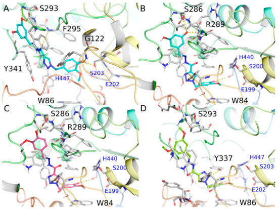 According to the ensemble docking results, the targeted compounds bind to the AChE cavity with the 4-hydroxy-3-methoxyphenyl ring from the intermediate hydrazide positioned at the bottom of the catalytic gorge, packed between the aromatic residues Trp84 and Phe330 through π-stacking interactions and the hydroxyl group donating a hydrogen bond to the His440 main chain (~3.0 Å). On the other side, the substituted phenyl ring from the hydrazone subunit is more exposed to the solvent near the peripheral anionic site (PAS) at the entrance of the gorge.