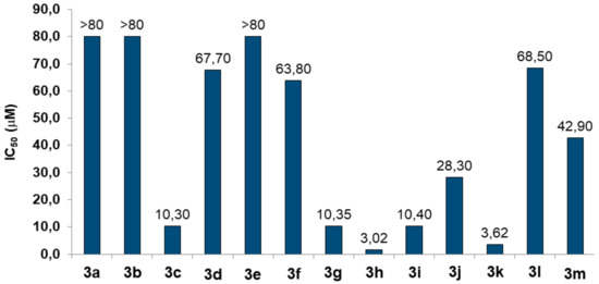 Toxicity of compounds 3a–3m in neuronal SH-SY5Y cells. Cells were incubated for 24 h with different concentrations of the compounds (2.5–80 μM). At the end of incubation, the neuronal viability was measured using MTT assay. Data are reported as IC50 values (concentration resulting in 50% inhibition of neuronal viability) of the compounds.