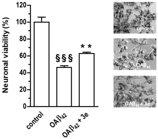 Given the best antioxidant profile of compound 3e we also evaluated its ability to protect the SH-SY5Y cells against the neurotoxicity elicited by Aβ42 peptide oligomers (OAβ42), soluble aggregates of Aβ peptides involved in the pathogenesis of AD. As shown in Figure 7, the concomitant treatment of SH-SY5Y cells with 3e (5 µM) for 4 h significantly reduced the loss of neuronal viability induced by OAβ42 (10 µM).