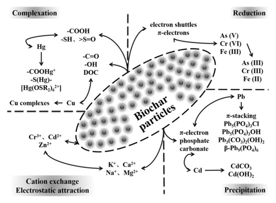 Hg, as a special metal, has great toxicity in soil, but biochar is an effective tool for soil remediation. As Wang et al. [31] remarked, the carboxyl group in a hardwood-derived biochar surface and soil Hg(Ⅱ) ion develop a coordination reaction generating a complex of -COOHg+ precipitate, thereby reducing the mobility of Hg and the thiol functionalities and sulfoxide groups are also able to react with Hg(Ⅱ) ion to form -S(Hg)- and [Hg(OSR2)62+] precipitates. Additionally, Xing et al. [28] found that rice-husk-derived biochar possesses a higher sulfate concentration compared with wheat-straw-derived biochar, which is more effective to promote the mercury–sulfur coordination reaction and to produce sulfides precipitation. It is extremely important to know that methylation of Hg is a special environmental biogeochemical behavior, and once the inorganic-Hg in soils is converted into methylmercury (MeHg), its toxicity and bioaccumulation will be enormously enhanced [108]. The release of rice root exudates reduced soil pH value, thereby enhancing the methylation of Hg, while the application of alkaline biochar increases soil pH value and effectively inhibits methylation. Zhang et al. [41] reported that sewage-sludge-derived biochar with high organic matter content can stimulate the growth and activity of heterotrophic microorganisms in Hg-contaminated acidic farmland soil, thus promoting the formation of MeHg. However, the utilization rate of MeHg in rice has been significantly decreased, which led to the inhibition of MeHg accumulation in rice and effectively reduced the bioavailability of organic-Hg [41].