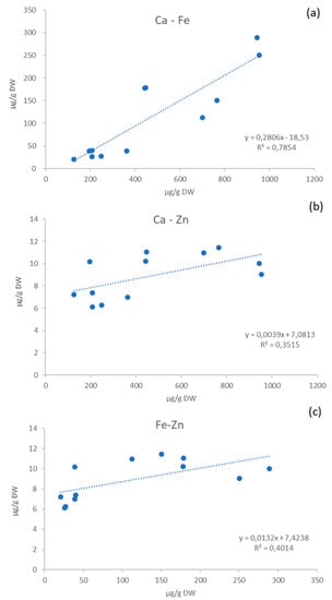 Calcium, iron, and zinc are among the main elements in potato, and are considered the most important minerals to human health. The correlations between the concentrations of each couple of these elements in the six Andean genotypes are shown in Figure 2. A strong relationship between the calcium and iron content was found (r2 = 0.78), in accordance with previous results reported by Andre et al. [5]. Otherwise, only weak correlations between calcium and zinc (r2 = 0.35) and iron and zinc (r2 = 0.40), were registered.