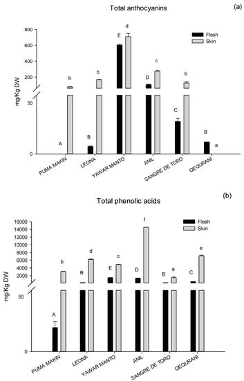 The total anthocyanins content in Figure 4a showed significant differences (p < 0.05) among the varieties, ranging from 6.3 ± 0.5 to 602.8 ± 12.3 mg/Kg DW for the flesh samples and from 74.3 ± 9.3 to 709.5 ± 40.7 mg/Kg for the skin samples. The Puma Makin variety showed a non-quantifiable amount of anthocyanins in the flesh tissue, while these pigments were undetectable in the skin of the Qequrani variety, in accordance with their flesh and skin colors (Figure 1 and Table 1).