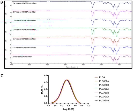 The untreated (PLGA) and CAP treated PLGA microfibers (n = 3 for each fleece type) were analyzed by Fourier transform infrared spectroscopy (FTIR) using an Nicolet iS10 FTIR spectrometer (Thermo Fisher Scientific, S.p.A., Milan, Italy) using an average of 64 accumulations and a resolution of 4 cm−1 in the range of 4000–650 cm−1. Three samples with the same conditions were used in this analysis.