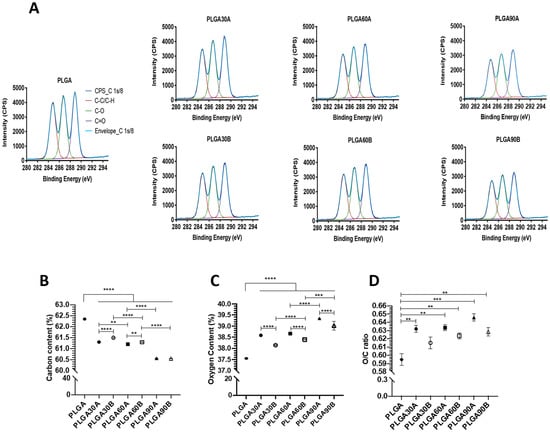 The elemental composition of the electrospun PLGA microfibers before and after CAP treatment has been assessed using the XPS technique. The surface activation of the electrospun PLGA microfibers after plasma treatment is attained by the incorporation of oxygen containing species as observed in Figure 3A. In detail, three carbon types can be detected from the deconvolution of the C1s signal of untreated and CAP treated PLGA microfibers that can be assigned to the C-C/C-H bonds of the hydrocarbon chain at 284.8 eV, the C-O and C=O bonds at 286.77 and 288.86 eV, respectively.