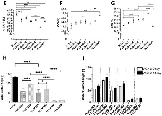 After being activated with plasma, the surfaces of PLGA microfibers can lose partially their hydrophilicity due to the reorientation of the integrated polar groups towards the material bulk as well as due to the reactions that occur after plasma treatment between the modified surfaces and present atmospheric components (CO2 and H2O) [105,106]. In order to assess the stability and the efficiency of the CAP treatment on the surfaces of the PLGA microfibers, the treated samples with different conditions have been conserved at room temperature and analyzed after 14 days to control the ageing effect and compared to those obtained at day 0 (Figure 3H,I).