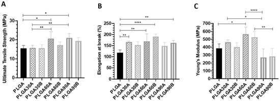 The elongation at break augmented gradually and significantly by increasing CAP treatment exposure time to reach a maximum after 60 s and decrease again after 90 s of treatment (p < 0.01). In detail, after 30 s of treatment, the elongation at break increased from both distances (1.3 and 1.7 cm) and only significantly from the shorter distance compared to the untreated materials (PLGA30A: 166.6 ± 4.756% vs. 118.2 ± 12.8%, p < 0.01). By increasing the exposure treatment time to 60 s from either both working distances, the elongation at break increased significantly to reach 169.7 ± 33.4% for PLGA60A (p < 0.01) and 191 ± 10.87% for PLGA60B (p < 0.0001) compared to untreated PLGA. Interestingly, after 90 s of treatment, the elongation at break property decreased again while maintaining values higher than that obtained with the untreated PLGA microfibers with a significant higher value treated with an exposure distance of 1.7 cm (p < 0.01).