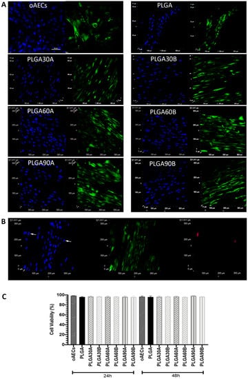To assess the effect of CAP treatment on the biological response of oAECs, cells were seeded onto the different PLGA microfibers at a density of 0.05 × 106 cells per sample. The cells were kept in the incubator for 2 h before adding 1 mL/each sample of GM composed of α-MEM supplemented with 10% FBS, 1% ultraglutamine, 1% amphotericin, and 1% penicillin/streptomycin and incubated at 38 °C with 5% CO2. After seeding, the PLGA and CAP treated PLGA microfibers placed onto glass discs were incubated in GM at 38 °C with 5% CO2 for 24 and 48 h. For all experiments, oAECs cultured on Petri dishes were used as control.