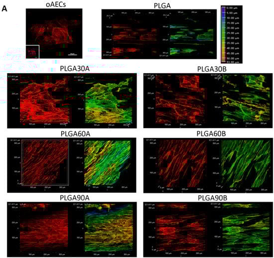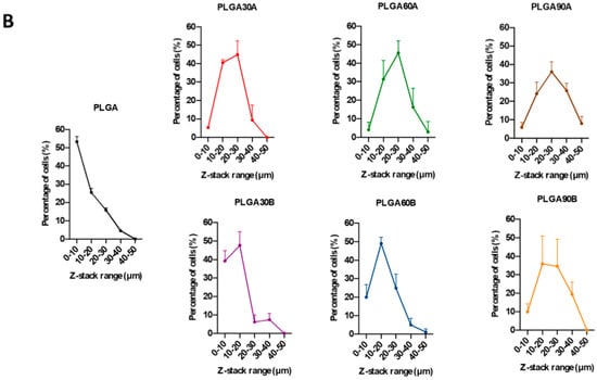 Cell penetration for oAECs cultured onto untreated and treated electrospun PLGA microfibers was investigated using the XZ projection acquired from confocal microscopy Z-stacks at a magnification of ×400, on which it was applied the depth-coded MaxIP (Maximum Intensity Projection). This analysis option allows the generation of a color gradient to the pixels on the images with the highest intensity values of the Z-sequences to determine cell penetration property within PLGA microfibers [10,25]. Cell penetration was quantified on depth coded MaxIP modified images by counting cell nuclei counterstained with DAPI of untreated and CAP treated electrospun PLGA microfibers (3 different fields/3 different samples/each group). In detail, the Z-stack acquisitions were divided into different layers (each layer had a thickness of 10 µm) on which the cell quantification was carried out. The results were expressed in percentage respect to the total cell count within the different Z-stack layers. Cellularity was calculated as the total number of DAPI stained nuclei inside a standard field of ×400 magnification from five images of three different samples for each sample type [90].