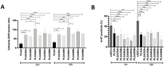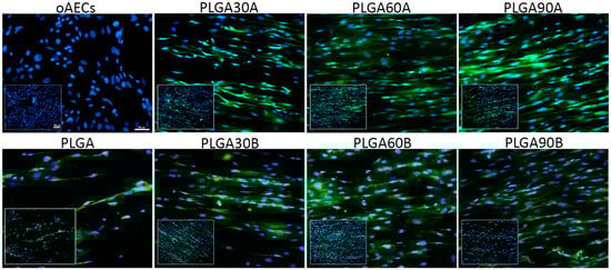To assess the effect of CAP treatment on oAECs proliferation, immunocytochemical analysis (ICC) was performed to evaluate the expression of Ki-67, a nuclear marker associated with cell proliferation. Cells seeded onto Petri dishes, on the untreated and CAP treated PLGA microfibers were quantified for their Ki-67 positivity after 24 and 48 h of culture (n = 3 for each fleece type/ time point). In detail, at these time points, cells were fixed with 4% paraformaldehyde for 15 min and washed thrice with PBS before being permeabilized with PBS/ 0.1% Triton X-100 for 5 min. After washing in PBS, the non-specific binding sites were blocked with PBS/1% BSA for 1 h. Afterwards, cells were incubated overnight at 4 °C with anti-Ki-67 primary antibody (Dako Cytomation, Glostrup, Denmark) diluted 1:50 in PBS/1% BSA. Primary antibody was revealed by using an anti-mouse Alexa Fluor 488 secondary antibody (Molecular Probes) diluted 1:100 in PBS and incubated for 1 h. Cell nuclei were counterstained with DAPI diluted 1:5000 in PBS (Vectastain, Burlingame, CA, USA). The primary antibody was replaced non-immune sera as negative control. All controls were negative.