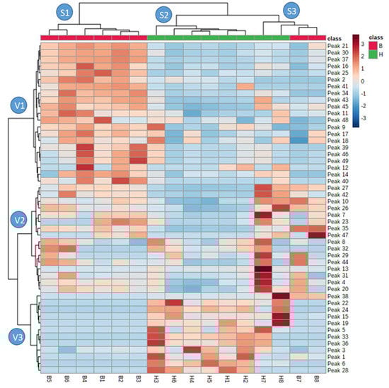Figure 2 shows the results of the hierarchical clustering analysis via heatmap. According to these results, three sample grouping clusters (S1, S2 and S3) have been obtained as well as three variable grouping clusters (V1, V2 and V3). Regarding the samples, most of the husk and bean cocoa extracts (samples 1–6) are grouped into two different clusters depending on the type of matrix (S1 and S2), respectively. The bean samples of the cluster S1 are characterized by presenting the highest concentrations of the variables grouped in cluster V1, which are mostly flavonoids. Regarding the husk samples, these are mostly characterized by the higher concentrations of the variables grouped in cluster V3, highlighting the presence of the five phenolic acids detected among them. In this sense, our results clearly revealed a higher flavonoid content in bean samples and a higher content of phenolic acids in husk samples. However, it is clearly shown that the samples 7 and 8 are grouped differently from the rest in the clustering analysis (cluster S3). These samples were those that presented lower results in the bioactivity tests (Table 2), and in general lower abundances in the detected phytochemical compounds (Table S1). This may be due to the fact that these samples are those obtained from regions of higher altitude within the samples with the genotype CCN51 from Leoncio Prado region (Perú). In fact, several studies have shown a negative correlation between the altitude and the synthesis of phytochemicals. For instance, Guerrero-Chavez et al. demonstrated this fact for the synthesis of anthocyanin from strawberry []. Nevertheless, these samples, especially sample H7, presented higher abundances of several compounds grouped in cluster V2 such as hydroxy-triaminoflavone, tri-O-methylsacarose, tyrosine, everlastoside C, hexenyl primeveroside or N-caffeoyl-l-aspartate isomers. The high presence of these compounds seems to be related to the particular conditions of this sample since these compounds presented lower amounts in the rest of the samples.