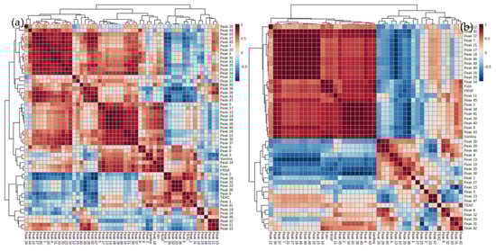 Correlation analysis using Pearson distance. (a) Husk and (b) bean samples. (Intense red or blue colors show positive or negative correlations, respectively).