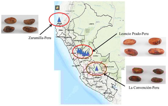 All cocoa samples were chosen based on geographical diversity in Peru, their production and availability. In addition, the origin (Figure 4), crop, drying types and methods of each genotype are described in Table 3. After pre-treatment process, husks were separated to the cocoa bean and each sample was ground using a laboratory mill.
