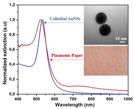 The normalized extinction spectra of the AuNSs before and after their immobilization onto the paper substrate. Inset upper-right: A representative TEM (transmission electron microscope) image of the as-synthesized AuNSs. Inset lower-right: A digital photograph of the paper substrate after the immobilization of the AuNSs.