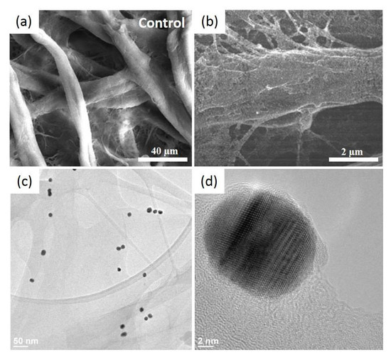 Representative SEM (scanning electron microscope) images of the pristine Whatman paper presenting its interconnected microfibers (a) and after the uniform decoration of the paper surface with the AuNSs (bright spots) (b), as well as typical HRTEM (high-resolution transmission electron microscope) images at low (c) and high resolution (d).