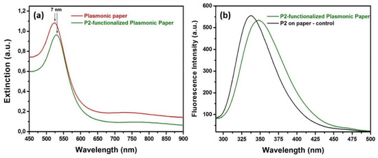 (a) The extinction spectra of the plasmonic paper before and after the functionalization with the P2 polypeptide and (b) fluorescence spectra of P2 on bare paper and on the designed plasmonic paper substrate.