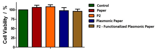 However, in the presence of the plasmonic paper and P2-functionalized plasmonic substrates, a small decrease in cell viability is observed. After the incubation with both plasmonic systems, the viability decreases 10%. Nonetheless, the decrease is not significant, indicating that the new obtained plasmonic nanoplatforms are not toxic for human skin cells, favoring their further implementation in antibacterial applications.