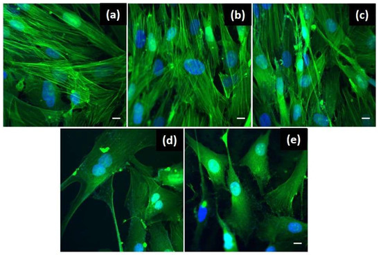 Confocal fluorescence microscopy images emphasizing the structural changes of the BJ cells after the 24 h treatment with: (a) no treatment-control cells; (b) Whatman paper itself; (c) free P2; (d) plasmonic paper-based nanoplatform and (e) P2-functionalized plasmonic nanoplatform. Scale bar is 10 μm.