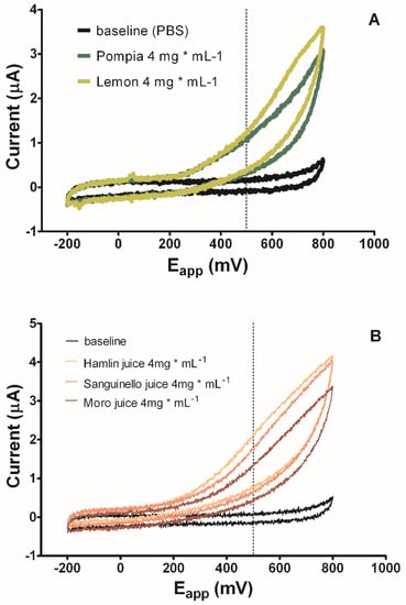 Cyclic voltammetry, with a scanned potential range (Eapp) comprised between –200 mV and +800 mV vs. carbon pseudoreference, in the absence (PBS black line) and in the presence of 4 mg mL−1 of Pompia (green line) and lemon (yellow line) juices (A), and in the absence (PBS black line) and in the presence of 4 mg mL−1 of Hamlin (yellow line), Sanguinello (orange line), and Moro (brown line) juices (B).