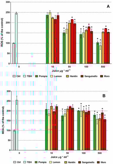 The ability of the juices to exert an antioxidant action was further tested in a more biologically relevant experimental system as the cell cultures. Differentiated Caco-2 cells were chosen as model of human enterocytes. Control experiments were first carried out to assess a potential juice cytotoxicity, but cell viability remained unchanged in the presence of all the tested juices, compared to untreated cells (100% of viability), in the concentration range of 10–500 µg mL−1 (Figure S6). Then, the potential protective effect of the juices against TBH-induced oxidative damage in CaCo-2 cell monolayers was investigated (Figure 2A). A highly significant steep increase of ROS production was caused by 2.5 mM TBH, in comparison with the untreated cells (control), starting from 15 min of incubation. TBH originates ROS in the reaction mixture that catalyze the peroxidation of membrane lipids [36]. In the presence of the juices, ROS production significantly decreased starting from 50 µg mL−1 in comparison with positive control (TBH 2.5 mM alone), and gradually lowered as the juice concentrations grew; at 500 µg mL−1, Pompia and Lemon were able to bring the ROS production back to untreated cells value. Orange juices appeared much less effective. The ability of the citrus juices to protect CaCo-2 cell monolayers against TBH oxidative injury was also assessed by measuring malonyldialdehyde (MDA) level after 2 h of incubation with 2.5 mM TBH, when an advanced peroxidation process had damaged the membrane lipid fraction giving rise to detectable oxidation products as MDA [37]. A 2.5-fold increase of MDA level compared with untreated cells (control) was observed in the culture medium of TBH-treated cells (Figure 2B). Treatment with the juices significantly inhibited MDA production starting from 10 µg mL−1 in the case of Sanguinello and lemon and from 50 µg mL−1 for all the juices.