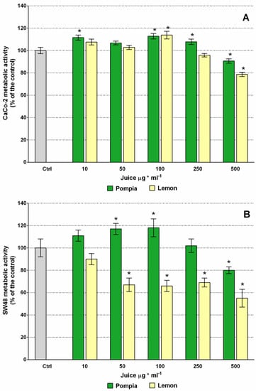 MTT assay was used instead to assess the metabolic activity linked to mitochondria functional state [39,40]. Orange juices of all varieties being totally ineffective on both cell lines, only the results of Pompia and lemon were reported on the graphs. The exposure of CaCo-2 to Pompia and lemon juices did not reduce the number of cancer cells, but a 15–40% and 10–20% increase was actually observed for Pompia and lemon juice respectively (Figure S7A). Differently, CaCo-2 metabolic activity (Figure 3) did not appear significantly changed by juice treatments, with the exception of a reduction of less than 10% and of 20% at 500 μg mL−1, for Pompia and lemon respectively (Figure 3A).