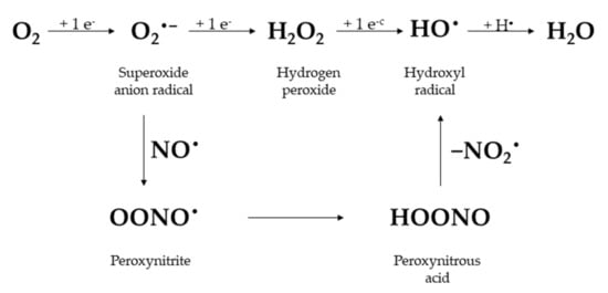 From biological point of view, superoxide anion radical is generated by the mitochondrial respiratory chain and phagocytic NADPH oxidase (nicotinamide adenine dinucleotide phosphate oxidase; NOX), so it is produced by respiration and component part of defense system [16]. It is known that human body produces around 5 g of ROS per day. These are with dynamic balance with the production of any oxygen forms essential for living and protection against the toxic influence of ROS [17]. In addition, an excessive amount of reactive nitrogen species is formed during the oxidative stress. The most common representative of RNS is nitroxide (NO•) produced by nitrogen oxidation catalyzed by NO-synthase [18]. NO• is able to rapidly react with reactive oxygen species (mainly with superoxide anion radical) and produce further reactive nitrogen compounds, for example peroxynitrite or peroxynitrous acid which can be further transformed to NO2• or •OH (Figure 1). These products may initiate new radical reactions leading to damage of biomolecules (nitrosylation of DNA or proteins) [19].