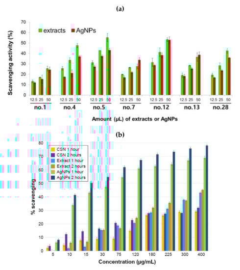 DPPH scavenging activity of (a) AgNPs prepared by Chinese plants extract [123], copyright permission by Elsevier; (b) AgNPs prepared by walnut green husk extract increasing in concentration and time [124], copyright permission by Dovepress.