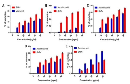 (A) DPPH assay, (B) total antioxidant activity, (C) H2O2 scavenging activity, (D) nitric oxide scavenging activity, (E) ferric reducing power assay of S. violaceus MM72 exopolysaccharide-mediated AgNPs with their respective standards. The data represent mean ± SD of the three replicates (n = 3) [155], copyright permission by Elsevier.
