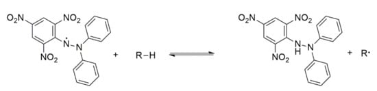 Among the most frequently used methods for determining antioxidant capacity are the ABTS and DPPH assays. DPPH• (2,2-diphenyl-1-picrylhydrazyl) is a purple stable free radical reacting with hydrogen donor (Scheme 1). The presence of delocalized spare electrons on the whole molecule prevents dimerization and also gives the color to the molecule of DPPH with absorption maximum at around the value of 520 nm in UV/Vis spectra. The DPPH• radical after reaction gives the reduced form DPPH (hydrazine form), which results in the color change from purple to pale yellow. The level of disappearance of purple color depends on the concentration of the antioxidant. The scavenging capacity is usually determined in organic solvents, not in aqueous media [12,39,41,42,45,46].