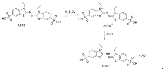 The ABTS (2,2′-azino-bis-3-ethylbenzthiazoline-6-sulphonic acid) method or the TEAC (trolox equivalent antioxidant capacity) is based on generating a cation radical ABTS•+ formed by emitting one electron from the nitrogen atom (Scheme 2). ABTS is usually first oxidized by potassium persulphate [49], manganese dioxide [50], or AAPH (2,2′-azobis-(2-amidino-propane) dihydrochloride) [51] which gives rise to the cation radical ABTS•+. It absorbs at 414, 645, 734, and 815 nm and gives blue-green color. The preferred wavelength is 734 nm because the interference with other absorbing components is minimized. The ABTS•+ reacts with antioxidant leading to the decolorization of a solution in the range of 1–30 min [12,39,41,42].