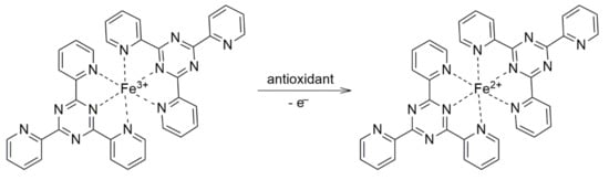 The FRAP (ferric reducing antioxidant power) assay is based on reduction of colorless Fe3+-2,4,6-tripyridyl-s-triazine complex to the intensively blue Fe2+-2,4,6-tripyridyl-s-triazine complex in acidic medium (Scheme 4). FRAP values are calculated from increasing absorbances measured at 593 nm [39,42,43]. The FRAP methods has several limitations. Compounds (even without antioxidant properties) with redox potential lower than the redox potential of Fe3+/Fe2+ pair may reduce Fe3+ to Fe2+ and can increase the FRAP value to obtain false high results. But, on the other hand, not all antioxidants reduce Fe3+ fast enough to measure [58]. Ferric reducing antioxidant power assay cannot be used for antioxidant acting as radical quench (with transfer of hydrogen) and for compounds absorbing at the wavelength of the determination, as the signals can interfere then [43,58,59].