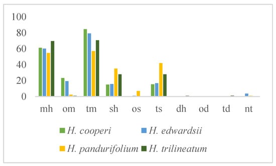 The aerial parts were collected during the flowering period and were dried at room temperature for 5 days up to constant weight. H. cooperi, H. edwardsii, and H. odoratissimum were collected in 2018, while H. pandurifolium and H. trilineatum were collected in 2019.