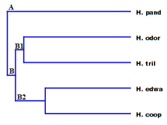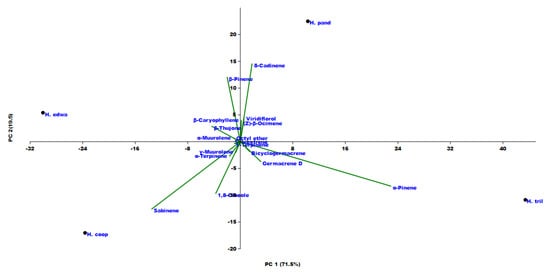 PCA and HCA statistical analyses were performed using the compounds present in amounts greater than 5% for at least one of the studied species (Figure 5 and Figure 6). The upper right quadrant of PCA analysis (Figure 5) included exclusively H. pandurifolium, whose main component was viridiflorol. H. edwardsii was located in the upper left quadrant, because of their higher percentages in both β-pinene and sabinene, compounds lading negatively with PC2. All the others species were in the lower left quadrant (PC 1 negative and PC 2 negative).