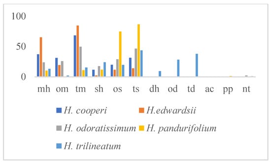 H. pandurifolium, less rich in the number of identified compounds (24), was dominated by the oxygenated sesquiterpenes (os, 74.7%) (Figure 4, Table 4) mostly represented by viridiflorol (60.3%). This EO pointed out almost the same amount in sesquiterpene and monoterpene hydrocarbons (11.8% and 10.3%, respectively) (Figure 4), and showed five exclusive compounds: pogostol (4.8%), germacrene d-4-ol (2.5%), (Z)-β-ocimene (1.1%), (E)-1(6,10-dimethylundec-5-en-2-yl)-4-methylbenzene (1.4%), and aristolochene (0.5%). H. odoratissimun EO evidenced a very close percentage of os, om, and mh (28.9%, 25.8%, and 23.7%, respectively) with epi-cubebol (9.0%), 1,8-cineol (25.1%), and α-pinene (16.5%) as the most representative compound in each class, respectively. It is fair to report that the exclusive constituents represented 19% of the identified fraction, where epi-cubebol and 14-hydroxy-9-epi-(E)-caryophyllene (5.0%) showed the predominant amount. More than 65% of the identified fraction of the EO composition of H. edwardsii was represented by monoterpene hydrocarbons (mh) characterized by sabinene (22.4%) and β-pinene (31.2%). This latter class was also the main one in H. cooperi (mh 37.1%), where sabinene was also present in a good percentage (14.7%). Oxygenated monoterpene (om 31.1%) was also in a good amount in this same EO, especially represented by 1,8-cineol (16.4%).