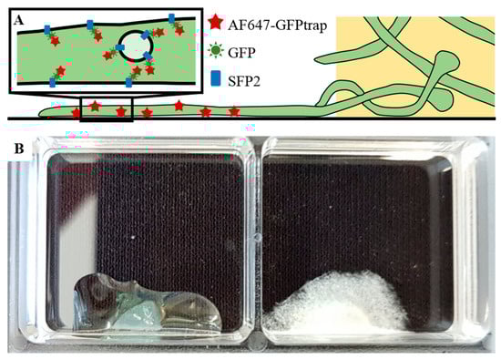 Sample arrangement for single-molecule localization microscopy (SMLM) measurements. (A) Schematic representation of T. atroviride (green) hyphae growing out of the agar block. For SMLM, GFP-fused Sfp2 protein was stained with an AF647-conjugated anti-GFP nanobody. (B) A sample holder showing an agar block with the medium before cultivation (left) and the mycelium after five days of incubation in darkness at 25 °C (right). This sample was then used in an SMLM experiment after fixation, blocking and staining the hyphae. The glass bottom of the 2-well chambers was coated with poly-D-lysine.