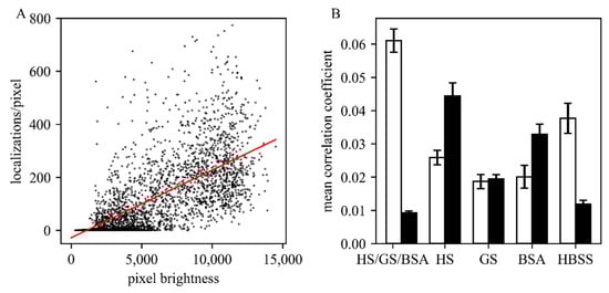Evaluation of different blocking solutions. (A) Exemplary correlation analysis for 369,261 localizations obtained per pixel via SMLM are plotted versus the obtained GFP signal per pixel. In this case, a correlation coefficient of 0.026 was obtained. (B) Comparison of the obtained correlation coefficients for the tested (combination of) blocking solutions horse serum (HS), goat serum (GS), bovine serum albumin (BSA), and pure Hank’s balanced salt solution (HBSS) buffer (five images were analyzed for each condition). Data obtained on the Sfp2-GFP strain and wild type are shown as white and black bars, respectively. In all experiments, the concentration of AF647 was 25 µM.