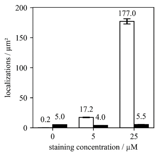 Comparison of localizations found per µm² for three different staining concentrations. We used 0, 5 and 25 µM of AF647 labeled nanobodies for wild-type T. atroviride (black bars) and the Sfp2-GFP strain (white bars). Five images were analyzed for each condition.
