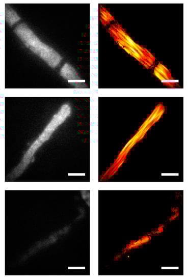 Figure 4 shows three exemplary images of single mature hyphae expressing Sfp2-GFP, both in the diffraction-limited GFP channel (left) and as a localization map from the related SMLM image (right). The diffraction-limited images indicate rather homogenous staining, except for septa, which are devoid of any signal (top row). Notably, the SMLM images show clearly visible structures parallel to the hyphal axis, with a width of approximately 500 nm. We interpret these structures as multiple Sfp2-positive vesicles arrested along cytoskeletal filaments, thereby outlining their contours. In diffraction-limited epifluorescence microscopy, signals corresponding to different filaments would overlap in 2D and 3D, leading to the observed homogenous staining. In SMLM, however, there is enhanced 2D resolution. Particularly, for similar background conditions, we previously quantified the 2D single-molecule localization accuracy, yielding approximately 30 nm [10]. The comparably large structures visible in the top row of Figure 4 hence likely reflect the true extension of filament bundles of a few hundred nanometers. In addition, signals from out-of-focus planes are efficiently rejected, leading to an apparent optical sectioning effect that further improves the identification of the filaments. These findings are in accordance with membrane proteins being transported in vesicles along microtubules and actin filaments to the hyphal tip in order to sustain polarized growth [16]. Furthermore, they support our previous findings from live-cell imaging analyses revealing that Sfp2 is associated with intracellular membrane clusters and vesicles [5]. The image shown in the last row of Figure 4 is a good example of a hypha with lower Sfp2-GFP expression, yielding both a lower signal in the GFP channel (left) and fewer localizations in the SMLM image (right).