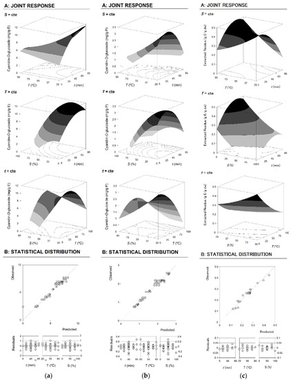 Graphical results for the response criteria (a) (mg anthocyanin/g dried epicarp), (b) (mg anthocyanin/g extract), and (c) (g extract/g dried epicarp). The 3D response surface graphs are shown in Part A. In each graph, the excluded variable is fixed at the individual optimum presented in Table 4. The goodness of fit is illustrated in Part B through the ability to simulate response changes between predicted and observed data and the residual distribution as a function of each variable.