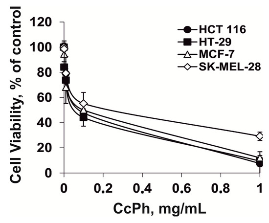 The cytotoxic activity of phlorethols from C. costata (CcPh) against colorectal carcinoma HT-29 and HCT 116 cells, breast cancer MCF-7 cells, and melanoma SK-MEL-28 cells. The cells were treated with CcPh at concentration of 0.001–1 mg/mL for 24 h. Cell viability was estimated using the MTS assay. Data are represented as the mean ± standard deviation (SD), as determined from triplicate experiments.