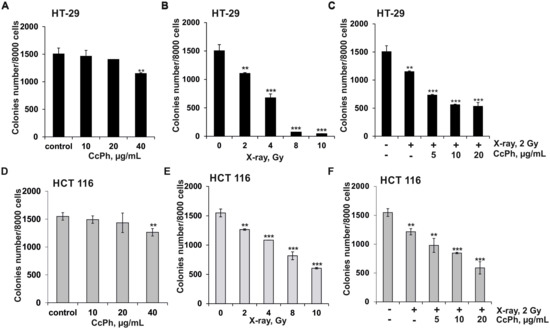 Under X-ray exposure, the number of colonies of HT-29 and HCT 116 cells were decreased by 24% and 21%, respectively, compared to the non-irradiated cells (control) (Figure 2C,F). The combinatory treatment with X-ray (2 Gy) and CcPh (5, 10, and 20 µg/mL) caused significant inhibition of colony formation of HT-29 by 28%, 39%, and 41%, respectively and HCT 116 by 15%, 24%, and 40%, respectively, compared to irradiated cells (Figure 2C,F).