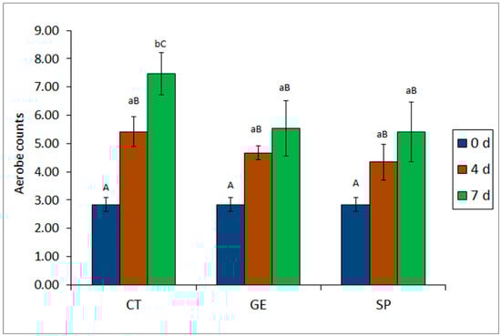 Aerobes count assessment (log CFU g−1 muscle) * in mackerel muscle stored under different packaging conditions **. * Average values of three replicates (n = 3); standard deviations are indicated by bars. Average values accompanied by different lower case letters (a, b) indicate significant differences (p < 0.05) as a result of packaging condition; average values accompanied by capital letters (A, B, C) indicate significant differences (p < 0.05) as a result of refrigeration time. ** Packaging conditions: CT (control polyethylene), GE (control gelatine) and SP (gelatine–spirulina).
