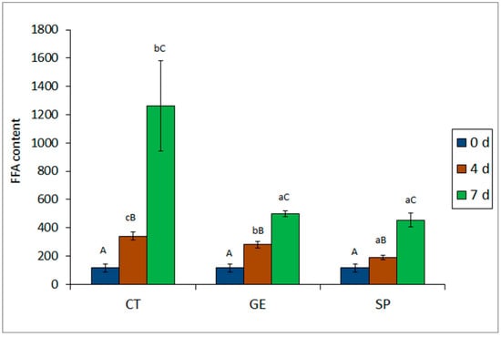 Evolution of free fatty acid (FFA) content (mg·kg−1 muscle) * in mackerel muscle stored under different packaging conditions **. * Average values of three replicates (n = 3); standard deviations are indicated by bars. Average values accompanied by different lower case letters (a, b, c) indicate significant differences (p < 0.05) as a result of packaging condition; average values accompanied by capital letters (A, B, C) indicate significant differences (p < 0.05) as a result of refrigeration time. ** Packaging conditions as expressed in Figure 1.