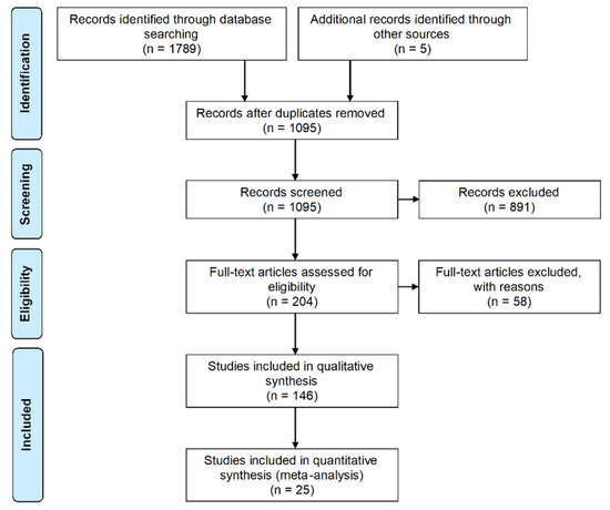 The literature search identified 1789 potential studies. From this number, 694 articles were found to be duplicates and the remaining 1095 studies were screened by reading the titles and abstracts according to the inclusion/exclusion criteria. From this screening, 204 papers were selected for full-text assessment. Accordingly, 146 papers were finally included for data extraction. As most articles reported antioxidant capacity under the DPPH (2,2-diphenyl-1-picrylhydrazyl) radical scavenging assay, a meta-analysis approach was additionally feasible to compare results among them. In this regard, we identified 23 studies providing the half-maximal inhibitory concentration (IC50, that is, concentration required for 50% reduction of the DPPH radical) as a result of DPPH assays. Furthermore, from the reported datasets of two articles, we were able to calculate the respective IC50 values. Thus, 25 articles were included in the meta-analysis. Figure 1 summarizes the full process.