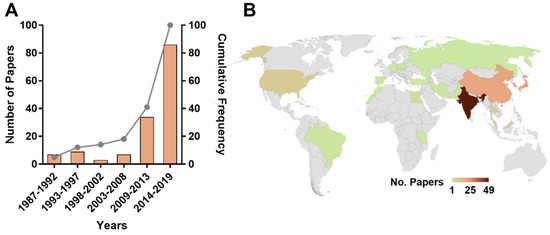 The number of papers in the literature by years and country of origin. (A) Publication distribution over the time. The first y-axis shows the number of papers and the second y-axis shows the cumulative frequency distribution. (B) World map showing the countries where the articles included in this review were produced, specifically, the corresponding author affiliation. Only in nine articles (6.2%), the sampling place for isolating Streptomyces was different from the country of the corresponding author (See Figure S1).