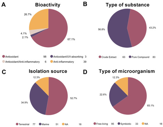 Regarding biological activities, most of the articles (73.3%) focused on antioxidant capacity (Figure 3A); 67.1% evaluated only the antioxidant potential, whereas 6.2% involved measurement of the antioxidant capacity along with other bioactivities (i.e., anti-inflammatory or UV-absorbing). The anti-inflammatory potential was reported in 26.7% of the studies. The UV-absorbing ability was evaluated in only three papers, representing 2.1% of the selected publications. In relation to the type of substance, there was no marked difference between crude extracts and pure compounds. Crude extracts were used by 43.2% of the articles and pure compounds were used by the remaining 56.8% (Figure 3B). Considering that Streptomyces are ubiquitous in nature, either in terrestrial or marine environments [53,54], we also examined the habitat source where the Streptomyces strain was isolated (Figure 3C). Although some papers (12.3%) did not document the origin of the isolated strain, most strains (52.7%) were isolated from terrestrial environments and 34.9% of strains were isolated from marine habitats. Finally, the role of symbiosis in the evolution of Streptomyces is a very important factor, particularly in their gene machinery for the biosynthesis of secondary metabolites [49]. For this reason, we considered whether the strains were isolated as free-living or symbiotic microorganisms (Figure 3D). We found that most studies focused on free-living Streptomyces (65.1%) and very few studies used symbiotic strains (22.6%).