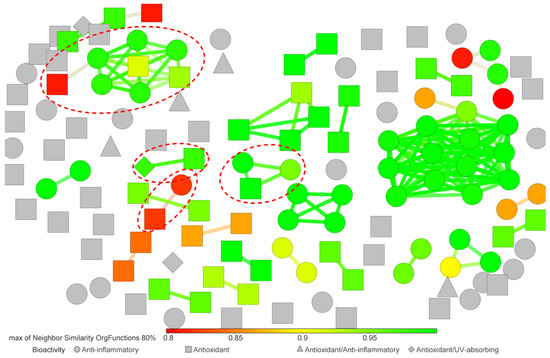 Similarity analysis of Streptomyces-derived photoprotective compound library. The similarity analysis was carried out using the OrgFunctions descriptor. The color scale bar indicates the level of similarity from red (0.8) to green (1.0). Each marker shape indicates the bioactivity reported for a given compound. The red dotted circles highlight compound clusters where metabolites with different bioactivity were grouped together.