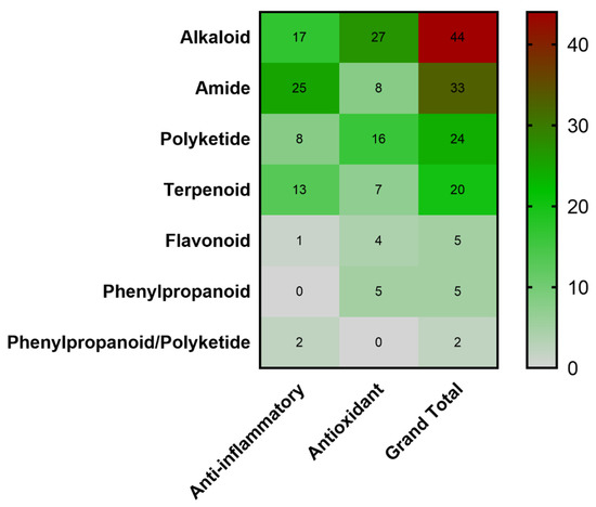 Heatmap analysis of Streptomyces-derived compound library. The compounds were classified as alkaloids, amides, polyketides, terpenoids, flavonoids, phenylpropanoids and mixed phenylpropanoid/polyketide according to the biosynthetically based chemical structure. Inside each cell, the number of compounds in the given group is presented. The color bar represents the number of compounds, gray (minor values), green (middle values) and red (high values).