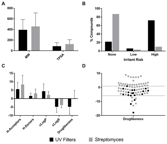 Considering that physicochemical properties, such as partition coefficient, solubility and molar mass are important properties of active agents affecting skin penetration [209], we calculated parameters associated with these properties (i.e., molecular weight, topological polar surface area (TPSA), octanol/water partition coefficient (cLogP), aqueous solubility (cLogS)), along with H-acceptors, H-donors and drug likeness, which are valuable criteria in pharmaceutical agents’ discovery [210,211]. Additionally, we calculated the irritant risk, which is a common side effect in sunscreen ingredients [212]. Figure 9 shows that irritant risk (Figure 9B) and druglikeness values (Figure 9C) were the properties with the most substantial differences. To better understand druglikeness differences, a dot plot was generated including UV filters versus Streptomyces-derived anti-inflammatory metabolites. It was found that most UV filters (83.3%) exhibited a druglikeness among −6 y 1, as well as many anti-inflammatory compounds (50.8%), as shown in Figure 9D. Regarding the risk of a compound to be an irritant, it was found that most UV filters (72%) were classified as high risk, as previously reported [212], in opposition with Streptomyces-derived anti-inflammatory compounds, in which only 10% had a high risk of being irritant (Figure 9B). This result gives an idea of the possibility of finding safer compounds in Streptomyces-derived metabolites for the development of better sunscreens.
