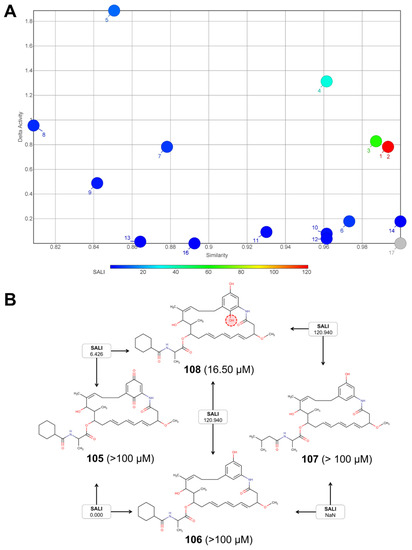 Pairs of structurally related compounds showing activity cliffs. A SALI analysis performed by DataWarrior identifies 17 metabolite pairs with activity cliffs. (A) For each pair of compounds, the delta of activity was plotted versus the similarity. The color scale bar indicates the SALI value from 0 (blue) to 120 (red). Each numbered label shows the pair of structurally related compounds listed in Table 5. (B) Structures and SALI values for selected compounds (i.e., 105, 106, 107 and 108 comprising the pair numbers 1, 2, 7, 15, 16 and 17). The values in parentheses indicate the IC50 experimentally calculated for each compound. Compound 108 differs from 105, 106 and 107 in the additional hydroxyl group at the aromatic ring (highlighted by the red dotted circle).