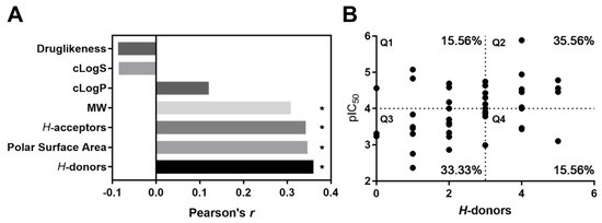 Correlation of molecular properties with antioxidant capacity in Streptomyces-derived metabolites. The properties druglikeness, cLogS, cLogP, molecular weight, H-acceptors, TPSA and H-donor were calculated by DataWarrior. (A) Pearson correlation coefficient between antioxidant capacity (pIC50) and each calculated property. Asterisk indicates statistically significant correlation. (B) Dot plot of antioxidant capacity (pIC50) against H-donor numbers. To evaluate the association of the property with the activity, a Fisher’s exact test was calculated (p = 0.0174). Quadrant 1 (Q1), quadrant 2 (Q2), quadrant 3 (Q3) and quadrant 4 (Q4). In each quadrant, the percent of dots is presented.
